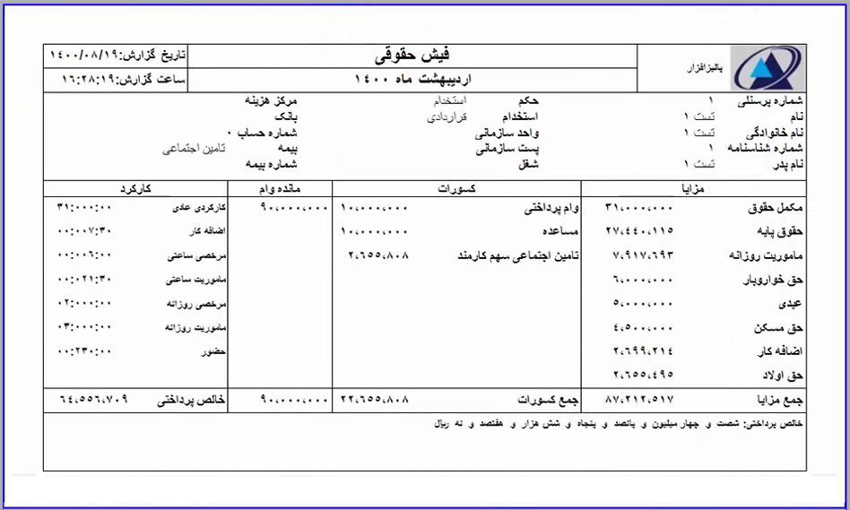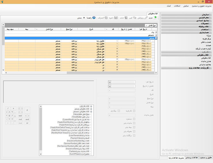 انجام هر نوع محاسبات با وجود امکان تعریف اقلام حقوقی مزایا و کسورات بدون محدودیت ساختاری و فرمولنویسی توسط خود کاربر